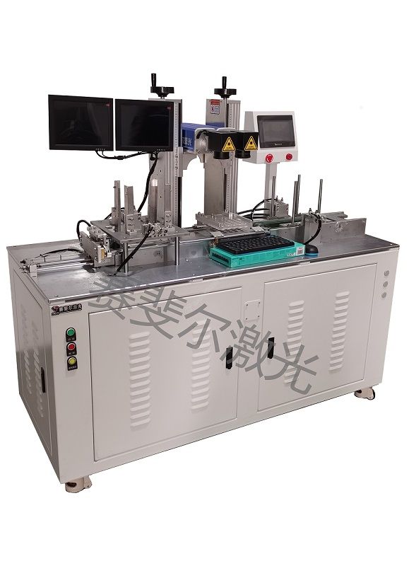 本系統設計為全自動工作方式,雙激光頭配置,由自動上下料工位、傳輸線、激光打標工位、自動上下料工位組成。